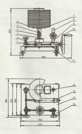 校驗泵和活塞部分安裝在同一底座(14)上借導管(9)相連,中間裝有針形閥(2 )。整個壓力計由四個水平調節螺絲(11)支撐,并借以裝于底座上的水平泡(12)用以較準水平位置。